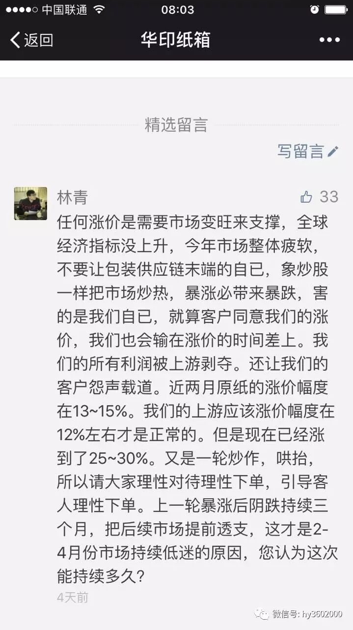 會上協會領導人之一的林青呼籲協會成員呼籲大家不要恐慌性下單,應冷靜對待,甚至可以通過停單、放假等形式堅決抵制紙和紙板亂漲價。