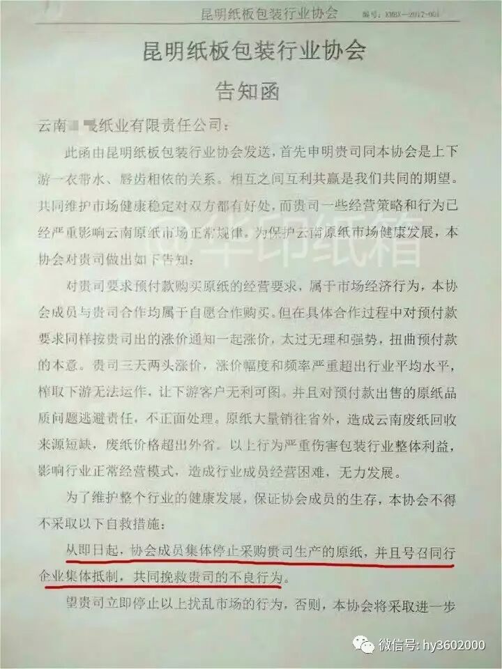 對貴司要求預付款購買原紙的經營要求,屬於市場經濟行為,本協會成員與貴司合作均屬於自願合作購買。但具體合作過程中對預付款要求同樣按貴司的漲價函通知一起漲價,太過無理和強勢,扭曲預付款的本意。貴司三天兩頭漲價,漲價幅度和頻率嚴重超出行業平均水平,榨取下遊無法運作,讓下遊客戶無利可圖。並且對預付款出售的原紙品質問題逃避責任,不正面處理。原紙大量銷往省外,造成雲南廢紙回收來源短缺,廢紙價格超出外省。以上行為嚴重傷害包裝行業整體利益,影響行業正常經營模式,造成行業成員經營困難,無力發展。