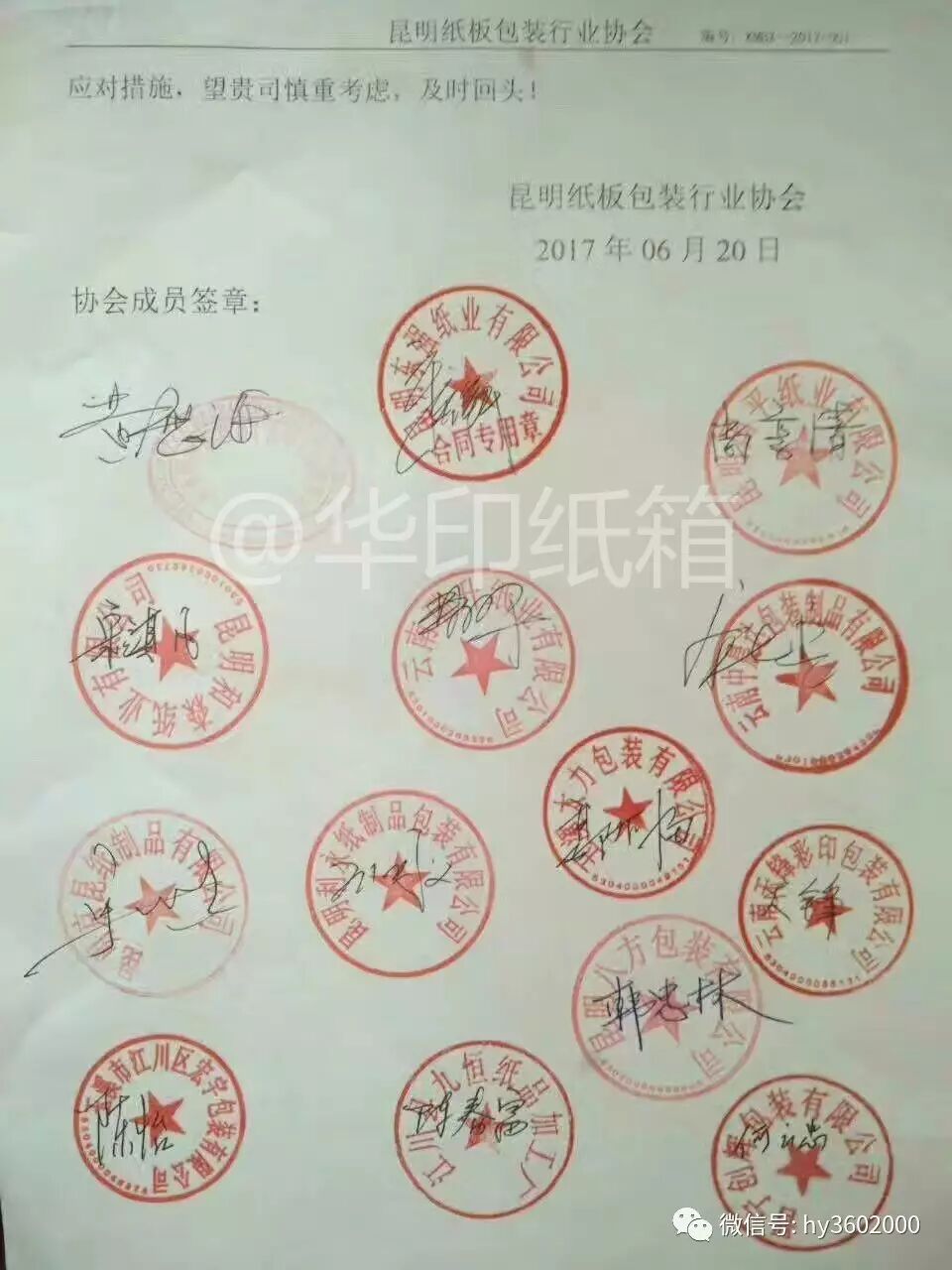 6月20日,一封署名為“昆明紙板包裝行業協會”的告知函在業界開始流傳,在函中該協會細數了該原紙廠數項擾亂市場的不良行為,並明確表示協會成員將一致采取自救措施應對。
